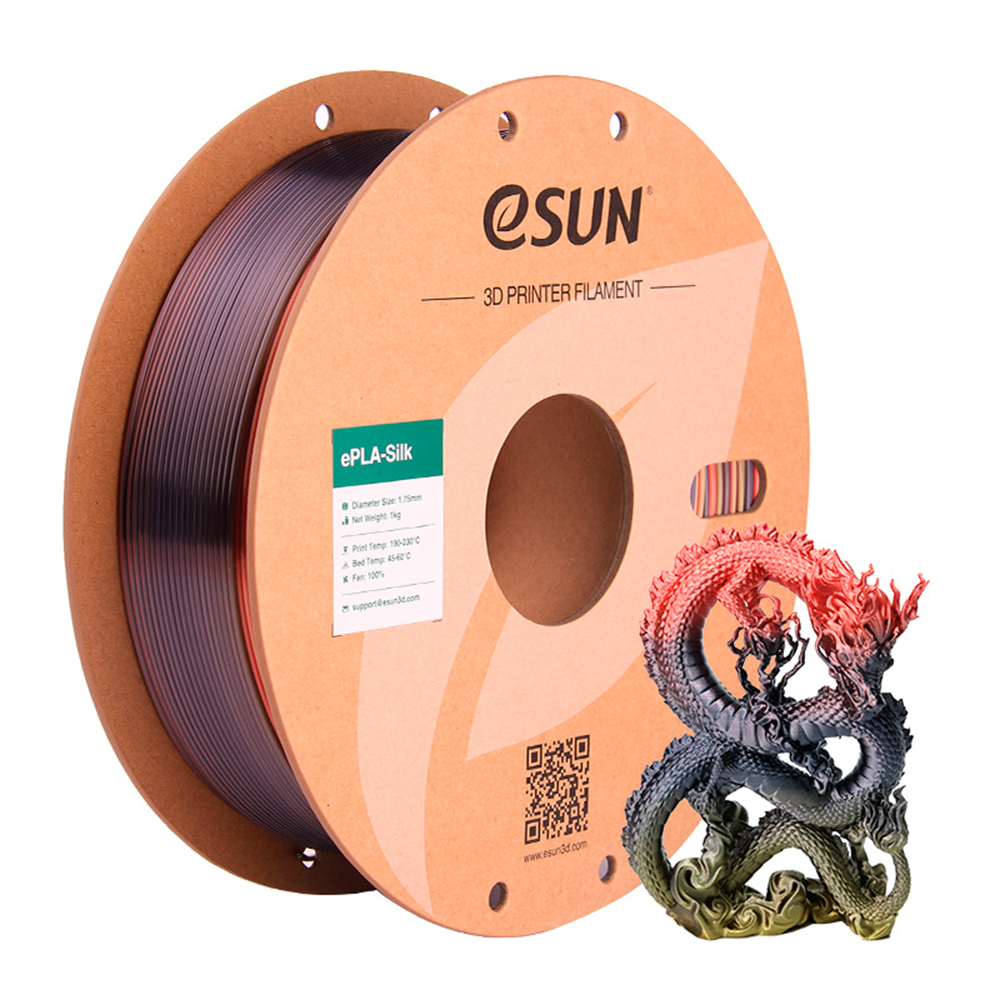 Jako najnowszy produkt eSUN, eSilk-pla jest modyfikowany poprzez dodanie materiałów o jasnych efektach w PLA, aby uzyskać bardziej błyszczący wygląd. eSilk-PLA jest podobny do filamentu PLA o dobrych właściwościach mechanicznych i dobrej wytrzymałości. Jest przyjazny dla środowiska i nietoksyczny. W porównaniu z tradycyjnym PLA, jedwabny materiał o wysokim połysku ma jasny, jedwabisty połysk. Jedwabne materiały drukarskie PLA o wysokim świetle może być szeroko stosowany w modelach o dużych zakrzywionych powierzchniach i praktycznych produktach, takich jak akcesoria meblowe, dekoracje, dekoracje zewnętrzne i inne. Ze względu na dobrą wydajność drukowania, doskonałe wykończenie i wygląd, produkt zyska coraz większą uwagę na globalnym rynku.