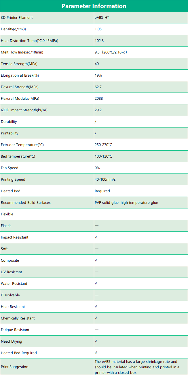 W oparciu o modyfikację materiału ABS, w porównaniu z różnymi materiałami ABS, ma zwiększoną odporność na temperaturę, z temperaturą odkształcenia cieplnego nawet do 100 ° C i może spełniać scenariusze zastosowań w wysokich temperaturach.