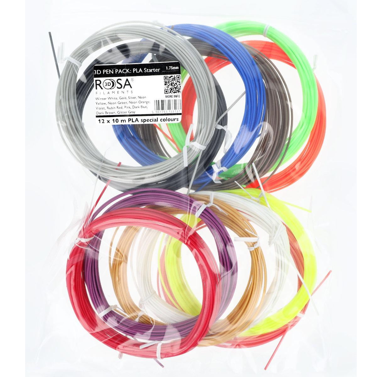 Zestaw zawiera 12 powtarzalnych kolorów podstawowych z oferty filamentów ROSA3D.Wybierając nasz zestaw masz gwarancję powtarzalności kolorów! NIE WYSYŁAMY LOSOWYCH KOLORÓW.W skład kompozycji ZAWSZE wchodzą następujące kolory :biały - PLA Starter 1,75mm Winter Whiteczarny - PLA Starter 1,75mm Blackszary - PLA Starter 1,75mm Grayniebieski - PLA Starter 1,75mm Blue Skyzielony - PLA Starter 1,75mm Greenczerwony - PLA Starter 1,75mm Redżółty - PLA Starter 1,75mm Yellowpomarańczowy - PLA Starter 1,75mm Orangebeżowy -PLA Starter 1,75mm Coral Pastelróżowy - PLA Starter 1,75mm Pinkfioletowy - PLA Starter 1,75mm Violetbrązowy/ciemny złoty - PLA Starter 1,75mm Pearl GoldNiektóre kolory dostępne są na szpulach jako osobne pozycje w sklepie.Zestaw filamentów kompatybilny z większością dostępnych długopisów 3D na rynku:Specjalnie przygotowany zestaw PEN PACK PLA 12 kolorów x10m, jest doskonały do tworzenia za pomocą długopisu 3D kolorowych obiektów przestrzennych.Idealnie dobrane kolory pozwalają tworzyć kreatywne obiekty przestrzenne, rozwijając przy tym wyobraźnie przestrzenna i fantazję najmłodszych i nie tylko. Doskonale sprawdzi się jako kreatywne hobby dzieci, nastolatków jak również dorosłych.Intensywne i żywe kolory filametów będą zachęcały do tworzenia ciekawych dzieł rozwijając talenty Twoich pociech! 12 podstawowych kolorów pozwala stworzyć wielobarwne konstrukcje i rysunki.PLA Starter (polilaktyd) to wytrzymały i łatwy w użyciu filament, idealny dla osób rozpoczynających swoją przygodę z drukiem 3D.Rozszerzeniem podstawowego zestawu kolorystycznego jest zestaw specjalny: PEN PACK PLA Starter 12 special colours x 10m - zawierający min  takie kolory jak złoty, srebrny, kolory neonowe.Zestaw kolorów Specjalnych znajdziesz na naszej innej aukcji.